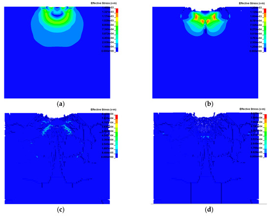 Microcrack extension process inside the material via perspective cloud maps at different times: (a) 0.2 s; (b) 0.4 s; (c) 1.2 s; (d) 2.1 s.