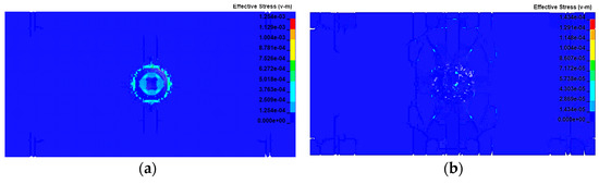 Figure 3 presents cloud views of the simulation results. After the impact between the tool and the workpiece, a compressive stress wave was generated rapidly and propagated in the direction of the impact normal. At the beginning, the compressive stress on the contact surface increased sharply and the material started to deform. When the stress suffered by the material was greater than its own compressive strength, the material in the area below the contact surface broke, and the cracks inside the material due to the impact continued to grow in the impact direction. If the velocity continued to increase, microcracks appeared inside the material; the reason for these cracks was that the workpiece material produced elastic–plastic deformation after the impact, and the elastic deformation returned to cause high tensile stress within the material. The tensile strength limit of silicon carbide is much lower than the compressive strength limit, and the material was in a high strain rate state, meaning that the fracture toughness was greatly reduced, and the microcracks resulted from the generation of tensile stress below the elastic deformation region. Driven by the elastoplastic stress field, the microcracks gradually expanded along the edge of the elastoplastic deformation area on both sides; the greater the impact velocity of the abrasive grains, the greater the kinetic energy, the stronger the elastoplastic stress field generated inside the workpiece, and the greater the expansion distance. The microcracks continued to expand, driven by the internal stress field, and finally interconnected and penetrated, leading to the removal of large brittle fractures in the material. Since the energy required to form cracks was much greater than the energy required to drive crack expansion, the resistance to plowing and scratching of the abrasive grains on the workpiece decreased significantly when the abrasive grains impacted the workpiece to produce microcracks, resulting in a decreasing trend of tangential grinding force. Figure 4 shows the force situation of the spherical abrasive grain impacting the workpiece with multiple rotations in the rotary ultrasonic vibration processing. The maximum principal stress on the workpiece occurred when the workpiece material was in contact with the tool and started to break, and the maximum principal stress on the workpiece reached the maximum value with the increase in the tool amplitude. From the result, the maximum principal stress on the workpiece was 110.25 MPa.