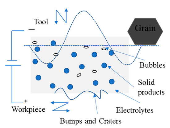 With high strength, high hardness and excellent wear resistance, metal matrix composites can replace monolithic metal materials or traditional alloy materials in many specific aspects, and have been widely used in aviation, aerospace, transportation and other industries with important applications in the design and manufacture of new components, gradually moving towards an industrial scale [1,2,3,4]. However, the properties of the two matrix materials of composite materials differ greatly. Grinding machining (GM) is one of the final machining methods for finishing aluminum matrix composites, which cannot be ignored because of surface damage such as cracking, splitting, particle displacement, accumulation, and severe tool wear [5,6]. Electrical discharge machining (EDM) inevitably produces a recast layer on the surface from high-temperature melting and enhances the “shielding” effect of particles on the interpolar discharge, which reduces the efficiency of material removal [7,8]. Electrolysis machining (ECM), on the other hand, leaves a “skeleton” of reinforcing particles after the processing of conductive metal-based materials, which cannot improve the surface quality [9,10,11,12]. Wang et al. investigated the application of rotary ultrasound in machining CFRP materials from different perspectives and developed a material removal model, and their experimental results illustrated that in the case of ultrasonic compounding, while the cutting force was significantly reduced, the surface roughness increased [13,14,15,16]. Li et al. designed and modeled a new three-dimensional ultrasonic vibration platform with tunable characteristics. Their platform can realize a variety of vibration modes including one-dimensional (linear) and two-dimensional (in-plane or out-of-plane) vibrations [17]. Schubert [18], on the other hand, superimposed ultrasonic vibration on non-conductive ceramics with high-depth-to-diameter-ratio micro-hole discharge processing, where direct vibration of the workpiece or tool can increase the micro-hole depth by increasing the feed rate and reducing the inter-polar abnormal discharge state. Bhattacharyya et al. studied the effect of tool vibration on the clearance environment of electrochemical machining, which enhanced the electrode transient cavitation when the amplitude is increased, thus improving the material removal rate and machining accuracy [19,20]. Zhu Yongwei et al. studied ultrasonic electrolytic combined machining technology with a low-voltage passivating electrolyte for hard-to-machine metal materials such as cemented carbide, and the machining efficiency, accuracy, and surface quality were significantly improved, which can effectively solve the problems of machining hard and tough metal materials with complex shapes [21,22,23].