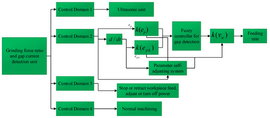 The control flow diagram is shown in Figure 7. During the machining process, if the grinding force ratio signal and current signal were within the control range of the machining system, they were sent to the fuzzy control unit, and the controller analyzed and processed them to adjust the feed rate and power supply. In the control process, the size of the deviation from the critical value was used as one of the reference conditions to determine the adjustment amount. In order to control the stability of the system and reduce the oscillation and overshoot of the process control, was the rate of change of the control, also used as another reference to control the adjustment amount. We compared the results with the set critical grinding force threshold based on the real-time detection grinding force ratio , and when the real-time detection grinding force ratio was greater than the set value, the workpiece feed rate was controlled in order to avoid short-circuiting.