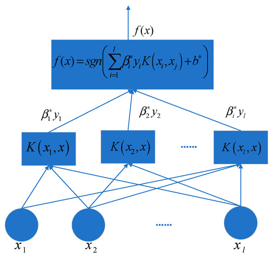 where is the inner product kernel function of the original sample set satisfying Mercer’s theorem, and after solving the pairwise problem, all the weights can be expressed by n non-zero Lagrange multipliers , , and the corresponding learning vectors . Finally, the optimal decision function of the support vector machine can be expressed as: