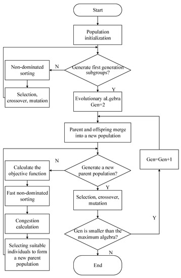 The NSGA-II algorithm is based on fast non-dominated sorting and an elite retention strategy, which retains the parent’s excellent genes to perform non-dominated sorting together with the offspring, and introduces crowding degree and crowding degree comparison operators, and finally the Pareto optimal solution can be obtained, composed of a set of multiple optimal process parameters, and the algorithm flow chart is shown in Figure 9.