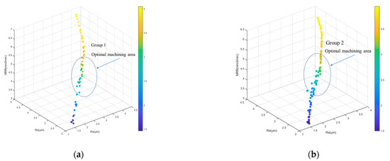 The second group increased the population size and the number of population generations, and the other two parameters did not change; the parameters that changed were (a) pop = 300 and (b) gen = 500. The results of the optimization model showed that the process parameters were optimized in the direction that maximized and minimized , , which was similar to the two-objective optimization, due to the fact that NSGA-II allowed the coexistence of all non-dominated frontiers. The difference between the fronts of the two groups of experiments was not significant, and the Pareto fronts marked by the blue elliptical boxes in the figures represent the final results of the integrated three-objective optimization, while the machining parameters are presented in Table 4. The optimization results are shown in Table 5, and Figure 10 presents the multi-objective optimization frontier. The mean value of surface roughness was 2.58 μm, that of edge roughness was 3.57 μm, and the mean value of the material removal rate was 2.01 mm3/min, according to the optimized parameters.