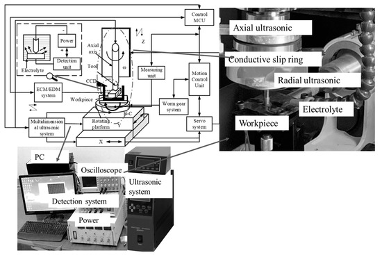 The principle of 2DRUEM machining was analyzed and explained in a previous paper. In order to confirm that the method can improve the machining quality of the combined electro-machining system, and that the gap detection and machining parameter optimization can both improve the machining system and enhance the machining quality, comparative experiments were designed to judge the comprehensive impact of the designed system on the machining effect by comparing the experimental results. The combined machining system used in this study was modified from the previous experimental setup, as shown in Figure 11. The experimental setup mainly consisted of the ultrasonic vibration system, the motion system, the control system, the electrochemical machining system and the electrolyte supply system, along with the machining status monitoring system and some other systems.