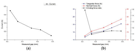 In order to study the feasibility of the online inspection scheme for the machining gap based on the fusion model of the grinding force ratio and current, experimental studies on the relationship between the grinding force and gap current with a machining gap were conducted using the machining system, and the experimental results are shown in Figure 12.