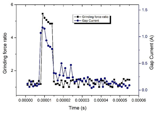 Change in current and grinding force ratio before and after the occurrence of short-circuiting.