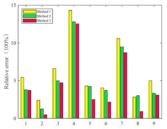 The relative errors of the nine test samples are shown in Figure 15, where Method 1 represents the values predicted using only the current value, Method 2 represents the values predicted using the grinding force ratio, and Method 3 represents the values predicted using the fusion algorithm. The average relative errors of the three methods were 8.77%, 9.71%, and 5.61%, respectively, and their maximum relative errors were 12.8%, 14.75%, and 12.08%, respectively. Thus, the performance of the fusion model can be evaluated as being better than that of the single sensor, both in terms of relative error and in terms of average relative error. The maximum error of the fusion model was reduced by 0.92% relative to Method 1, and in comparison to Method 2, the maximum error of the fusion model was reduced by 3.67%, both of which represent relatively significant improvements, and this improvement did not sacrifice the average relative error as an evaluation metric. Therefore, for the multivariate nonlinear gap detection of electro-machining processes, the use of the PCA-based support vector machine fusion algorithm can improve the prediction accuracy of the model with relative advantages over the use of a single sensor, which can improve the prediction accuracy of the model.