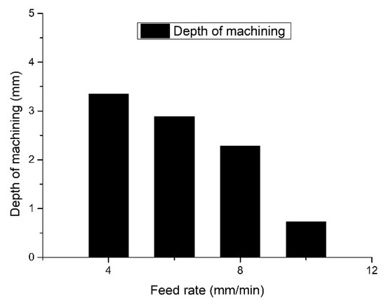The basic parameters used in this experiment were the same as in a previous paper, and the corresponding feed rates of the tool electrodes were 4 mm/min, 6 mm/min, 8 mm/min and 10 mm/min. The experimental results are shown in Figure 16. When the machining was stopped automatically after a short-circuit was detected without a detection system, a short-circuit occurred after 3.42 mm of machining at a feed rate of 4 mm/min; a short-circuit occurred after 2.89 mm of machining at a feed rate of 6 mm/min; and a short-circuit occurred after 2.24 mm of machining at a feed rate of 8 mm/min. When the feed rate was increased to 10 mm/min, the short-circuit occurred when the machining was carried out to 0.83 mm and the machining was forced to stop. From the above experiment, it can be seen that as the feeding speed of the tool electrode increases, the time interval from the start of machining to the short-circuit between the tool electrode and the workpiece is shorter and the machining depth is shallower. Additionally, when there was gap detection for a short-circuit in the machining process of combined machining at different feed speeds, the short-circuit detection protection was set in that condition. The machining process was found to be continuous for all of the same feed speed conditions. Even with the increase in the feed speed, the whole machining process can be still ensured, which was completely different from the machining result with no gap short-circuit detection.