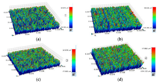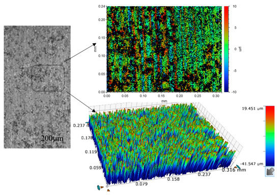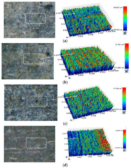 When a short-circuit occurred, the current instantaneously became higher and the grinding force ratio instantaneously increased, as shown in Figure 13, and the sudden changes in current and grinding force were almost synchronized, which further demonstrated that the use of grinding force and current detection as a control to judge the gap decision. Figure 14 shows the 3D microscopic surface of the workpiece with and without gap inspection, and it can be seen that the machining quality was worse, and the grinding marks on the machined surface are serious and uneven without gap inspection.