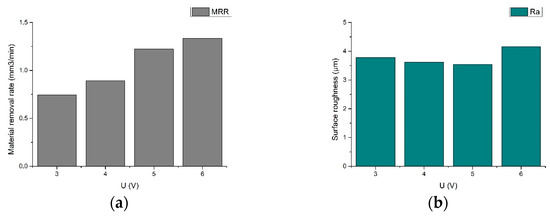 Material removal rate and surface roughness variation with machining voltage: (a) material removal rate variation; (b) surface roughness variation.