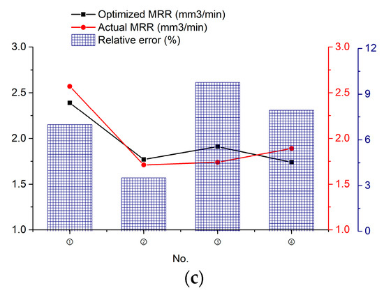 The reasons for the errors in the optimized model were evaluated. On the one hand, the samples were not substantial enough, while other factors in the simplified model had less influence; in addition, the random influence in the machining process may have led to the discrepancy between the predicted and the actual machining effects. Overall, based on the above analysis, the experimental results can confirm the efficiency of the established combined electric machining parameter selection model. The intelligence of parameter selection can reduce the dependence on the operator’s experience, which can effectively improve the total performance of the machining system.