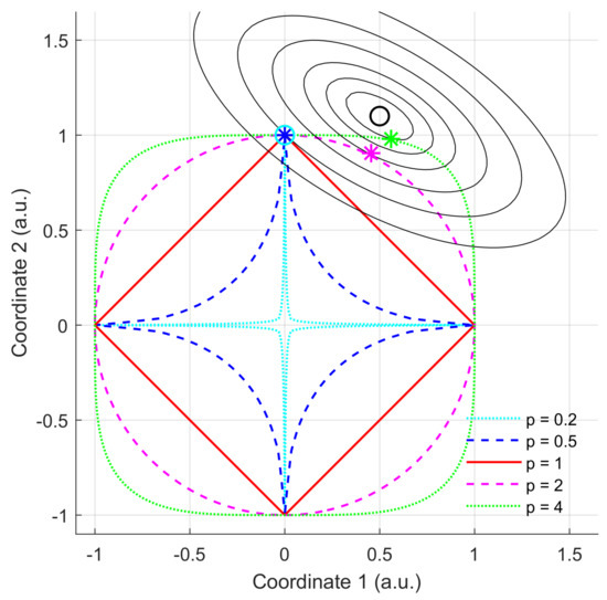This figure depicts the contours of a bivariate quadratic function (black ellipses) with the global minimum represented by the black symbol ‘o’. The constraint is defined by the norm for different values of p. The feasible domain corresponds to the interior of the domain, defined by the outer dotted green curve () and outer dashed magenta curve (), which correspond to the Euclidean norm. The red plain curve corresponds to (), the inner dashed blue curve corresponds to (), and the inner dotted cyan curve corresponds to (). The solutions are indicated by the coloured symbols located in the domain boundary corresponding to each selected value of p. As can be seen in this figure, when , the solution becomes sparse (only one component of the solution differs from 0).