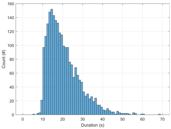 Using the proposed sparse decomposition method, we have defined a detector that takes into account the temporal organization of the Bernoulli–Gaussian time series and its amplitude (to avoid a possible high rate of false alarms). Our detector is adapted to this temporal organization. As mentioned in the introduction, apnoea corresponds to relative bradycardia followed by tachycardia. The bradycardia event, which appears during the apnoea event, is generally longer (ranging from 5 to 50 s, see Figure 4) than the tachycardia event that appears at the end of the apnoea. Using our sparse representation, apnoea-related bradycardia is associated with a succession of negative spikes, while the following tachycardia event generally corresponds to a single positive spike. Body movements or other cardiac arousals are associated with a relatively long tachycardia, resulting in a succession of positive spikes (see Figure 5). Therefore, to detect apnoea, we focus on each individual positive spike (to discard body movements or other cardiac arousals) that is preceded by one or more negative spikes appearing within the time window , where denotes the time instant of the (single) positive spike that exceeds a threshold introduced below. The histogram of apnoea durations established from our internal data (Figure 4), which is presented in the following section, helped us define this time window.