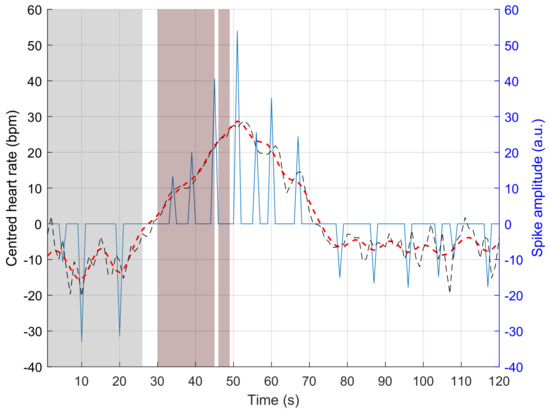Effect of a movement on the sparse decomposition; sparse model (blue spikes), high-pass filtered heart rate (plain black line), and reconstructed heart rate (dashed red line); apnoea highlighted by the greyed areas and movement highlighted by the red patches.