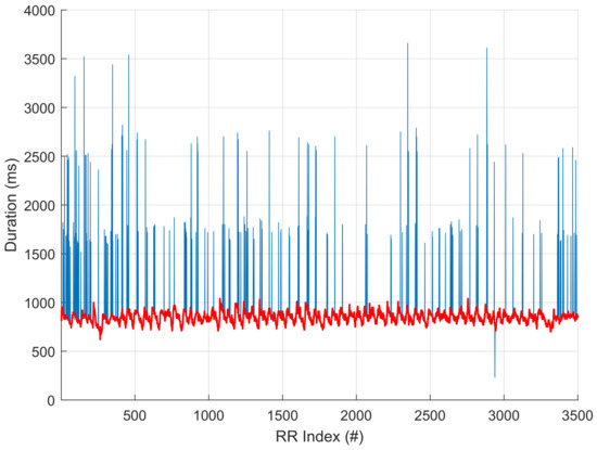 Input RR intervals (blue line) and output of the de-noising two-pass conditional median filter (red bold line).