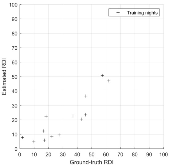 In Figure 7, a comparison between ground-truth and estimated RDI is presented for the training nights (one night per recording). The results are promising, and although they would not allow for accurate categorisation of apnoea severity (i.e., on a four-class, standard assessment of severity), they are still a good prediction of the apneic status of a given person or recording.