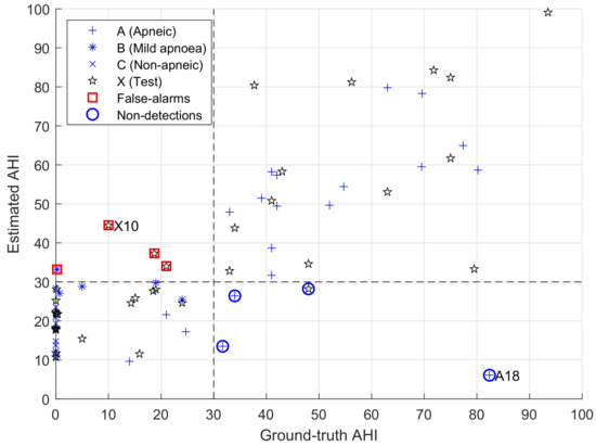 Recordings with an AHI value above 30 are considered severely apneic, while those below 30 are moderate-to-non-apneic. We use the same value of the threshold on the estimated AHI (represented by a horizontal dashed line) to evaluate the detection performance. We are now able to count the occurrences of correct and false detections. In this database, our results show a sensitivity of (27 out of 31 severely apneic recordings are correctly detected) and a specificity of (only 4 out of 39 moderate-to-non-apneic recordings are incorrectly classified as severely apneic).