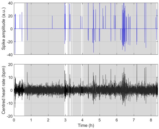 We would like to remind the reader that the device to be used (Somno-Art) and the associated software were initially developed for automatic sleep staging [6,7] using the heart rate obtained via photoplethysmography and the movements measured by a three-dimensional accelerometer. To select our threshold (i.e., the amplitude of the tachycardia or positive spikes), several possibilities were studied, including using the hypnogram to find transitions from slow wave sleep to light sleep or wake, as these transitions correspond to a change in the sympathovagal balance (and of the HRV). The second considered possibility was to use the response of the heart rate to movements, and the third was to study the dispersion of the heart rate during wake (here again using the hypnogram).
