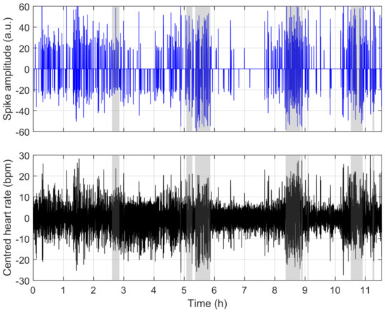 Example where the model works as intended for a whole night. The figure shows the output of the sparse model (upper blue spikes), the high-pass filtered heart rate (lower black curve), and the ground-truth apnoea (vertical grey patches).