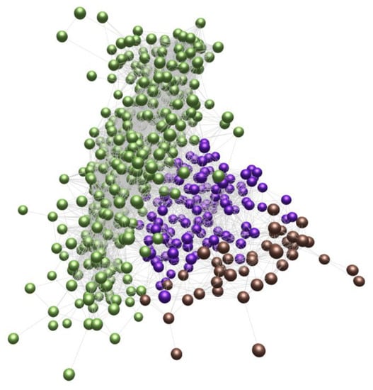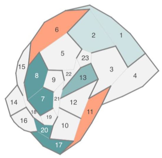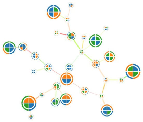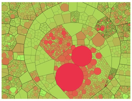 Another visualization model that also expresses hierarchical networks and does not have the listed disadvantages is Voronoi treemaps []. Like tree maps (Figure 7), Voronoi treemaps (Figure 8) consist of nested regions that can be specified in color, size, and transparency; however, tree nodes are presented not by means of rectangles but by polygons. The use of polygons allows one to effectively distinguish different objects from each other and thereby level out the disadvantages of information perception inherent in treemaps [].