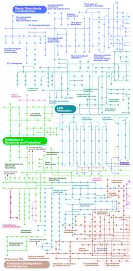 - iPath3 Pathway Maps Project. Available online: https://pathways.embl.de/ipath3.cgi?map=metabolic (accessed on 1 March 2023).