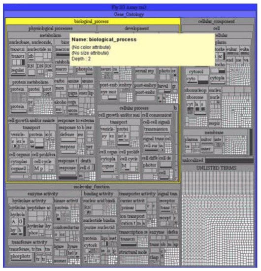 For example, in Figure 4, the selected biological process is highlighted in yellow, displaying more detailed information in other windows. The hierarchy of treemaps allows one to see all the data in their entirety and quickly navigate the structure.