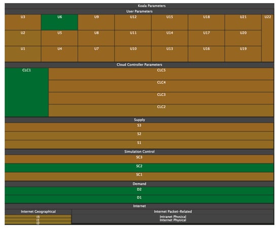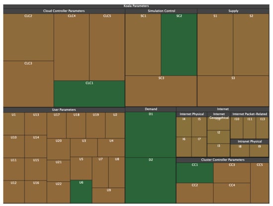 The disadvantage of treemaps in terms of information perception (and, consequently, the speed and quality of analysis) is that with a large number of child nodes or with a large spread in the size of child nodes, rectangles with a large width-to-height ratio appear (Figure 5). This problem is solved by using ordered treemaps [], squarified treemaps [], or clustered treemaps []. The same tree in Figure 5 is redrawn using squarified treemaps [] and presented in Figure 6. Another problem is the difficulty in defining nesting boundaries that result from using rectangular nodes.