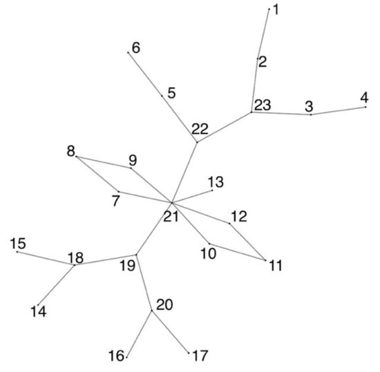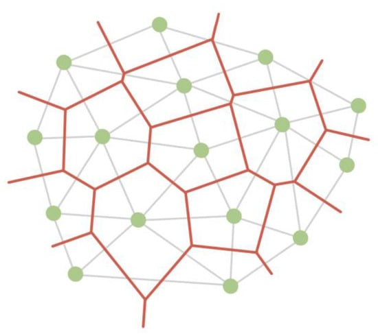 Thus, Voronoi treemaps have been further developed in the form of Voronoi maps [], which display the topology based on the ratio of polygons rather than their nesting. Voronoi maps can display networks with a planar topology, in which a polygon represents the network node without intersections, and the connections between the nodes are represented by the contact of polygons with edges. In such a structure, separators can also appear, i.e., edges that, on the contrary, separate rather than connect nodes. An example of a Voronoi map and the graph on whose basis it was built are shown in Figure 9 and Figure 10.