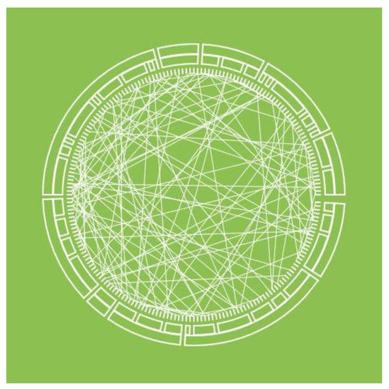 Chord diagram with straight edges. The outer shell consists of three rings, displaying a hierarchical topology. The inner shell consists of an unconnected graph.