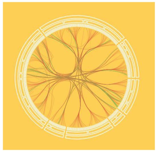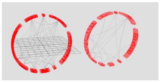 There are networks with two types of links between nodes: hierarchical links and unstructured ones. They can be presented as a special case of the chord diagram (Figure 11 and Figure 12) [,,,]. In this approach, the object hierarchy is displayed as an inverted radial graph. Inside it, in the first ring, are the leaves of the tree. On subsequent rings, the ancestor nodes of the elements of the previous rings are located. The connection between the nodes is denoted as the presence of common x-coordinates in the radial reference system.