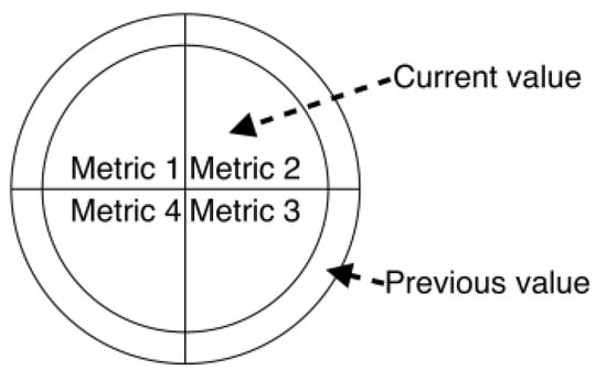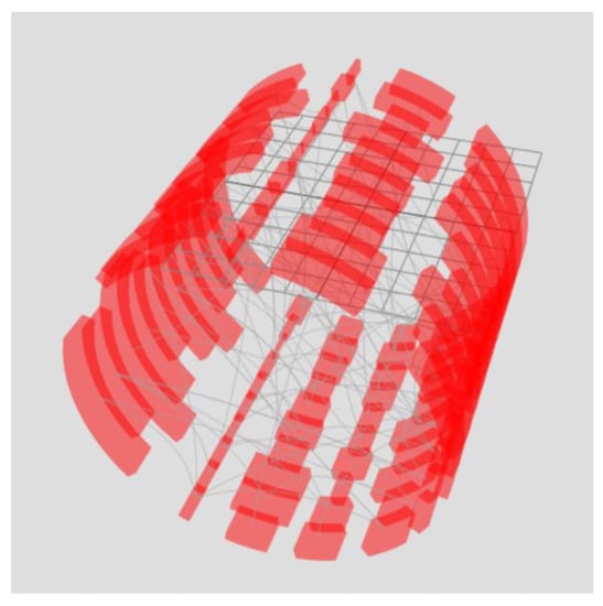 A stacked chord diagram is a torus that consists of rings, and each ring is located along the z-axis and displays a specific state at the corresponding moment in time. Rings consist of arc nodes. Node options can be displayed as the arc length, arc thickness, arc color, or arc transparency. Thus, the rings, located one after another, reflect the dynamics of the parameters change over time (Figure 13—only one parameter is used in the figure in the form of the arc length). Analogous to the chord diagram, inside the rings, there is an unstructured graph that connects the elements of the rings.