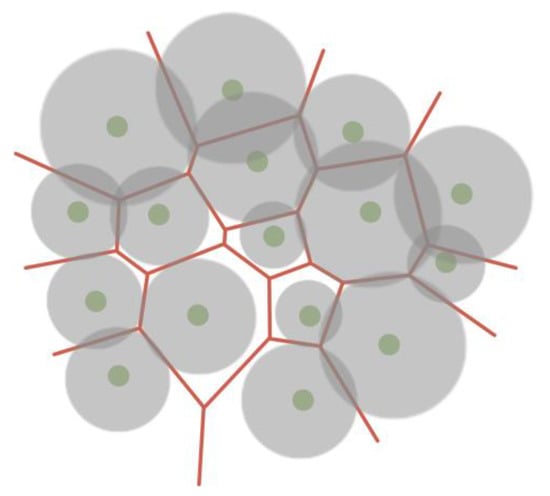 A Voronoi diagram can be used to visualize compound data structures, such as ones describing proteins, atoms, or amino acid residues. This model is built on the basis of points (centroids) and divides the plane into polygons, which are called Voronoi cells. Each centroid corresponds to a Voronoi cell. In the classical Voronoi diagram, the cells have the following mathematical meaning: any point of the Voronoi cell is closest to the centroid based on which the cell was built (Figure 16). Each cell can be considered a zone of influence of an atom or other object, played by a point [,,,].