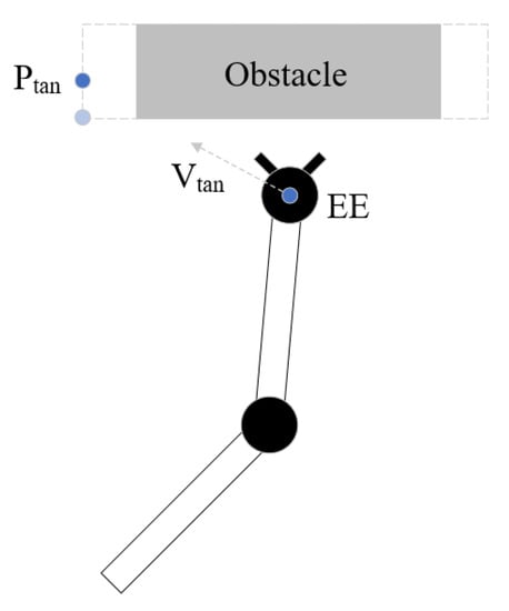 The repulsive joint speed cannot be calculated directly, similar to the attractive joint speed, because obstacles do not act on the end effector necessarily. In most cases, they act on other links. When an obstacle acts on the link