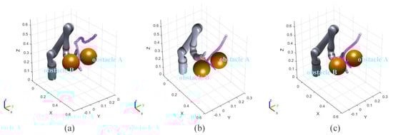 m. Two static spherical obstacles (obstacle A and obstacle B) are set at (0.45, 0.1, 0.4) and (0.45, −0.1, 0.4), respectively, and the radius of the two obstacles are both 8 cm. The target point is set between two obstacles and the coordinate is (0.45, 0, 0.4). The purpose of the experiments is to plan the path so that the end effector can move to the target point. The experimental process and results are shown in