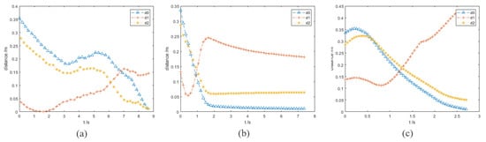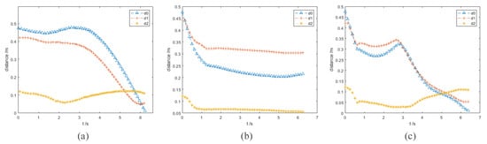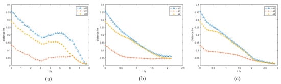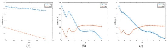 In this group of experiments, the obstacle A becomes a dynamic one. The velocity vector of obstacle A is (−0.05, 0.2, 0.05) and its unit is m/s. The running processes and distance curves of the different algorithms are shown in