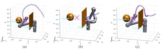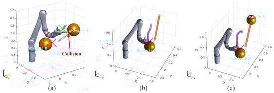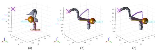 Figure 8a, the robot arm collides with the obstacle A in 1.5 s. The informed RRT* algorithm does not have real-time obstacle avoidance capability in this experiment.