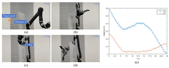 Figure 11a shows the initial state of the robot arm, and (b) to (d) show the state of the robot arm in the experiment. It can be seen from the figures that the robot arm can cross the obstacle and maintain a distance with the obstacle. The minimum distance between the robot arm and the obstacle is 2.5 cm, which can be seen in