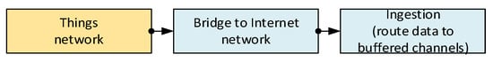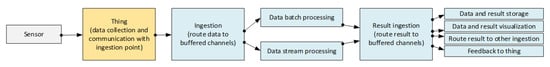 The IoT maintenance system is based on measurements delivered in time series to the cloud. The most important part is to prepare data pipelines for fast transmission from sensors to the fault diagnosis server. At low level, analogue sensors are handled by ADC (analogue-to-digital converter). However, modern sensors are equipped with ADC and communication interfaces. Therefore, the sensor is connected to thing (microcontroller or microcomputer) by communication interface like SPI (Serial Peripheral Interface), I2C (Inter-Integrated Circuit), UART (universal asynchronous receiver-transmitter) or another device-specific communication interface. In the first stage of buffer, the classical producer–consumer application is applied between the sensor and the thing (microcontroller) where the sensors are equipped with internal buffers of several samples. The sensor is a producer of data and the thing is a consumer. The next stage is the use of data by microcontroller internal algorithms. The next stage of buffering is a producer–consumer application where the microcontroller is a data producer and the consumer is a cloud (server)-based fault diagnosis system. In each stage of data processing, the producer–consumer uses buffer for data. The general structure of the buffer-connected data pipelines is presented in Figure 1. Modern buffers offer routing to selected destinations which lead to processing in chain by micro services which are easy to modify compared to change in one large service. The collected data can be processed by the fault diagnosis system in two general ways, (a) batch processing or (b) stream processing. Batch processing is performed with data collected in a time window, but not often. Data stream processing is similar to batch processing but is performed repetitively in micro batch and can use the result of the previous micro batch result in the current micro batch processing.