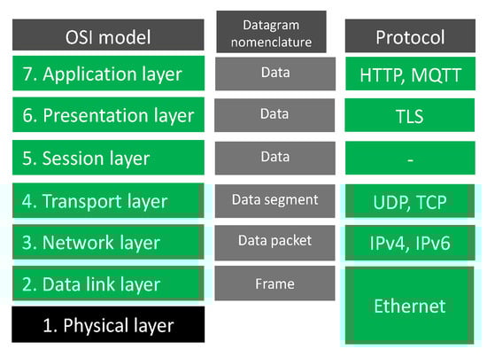 The general structure of data pipelines presented does not explain which protocol is used by the thing to ingest data to the cloud. Data collected in the thing network called OT (Operational Technology) are ingested into the cloud in the IT (Information Technology) network by the bridge system (Figure 2). OT part of the network is very wide. In IIoT, fieldbus interfaces can be CAN (Controller Area Network), RS232 (Recommended Standard 232), RS485 (Recommended Standard 485), industrial Ethernet, HART (Highway Addressable Remote Transducer), and other physical layers. The main fieldbus technologies used in industry are presented in the IEC (International Electrotechnical Commission) 61784-1:2019 standard []. The 2019 standard groups communication technologies into 19 CPF (Communication Profile Families). The CPFs are divided into 24 profiles: Foundation™ Fieldbus H1 (31.25 kbit/s), HSE (High-speed Ethernet); ControlNet, Ethernet/IP™, DeviceNet®, Profibus DP (Decentralized Peripherals) and PA (Process Automation), P-NET®, WorldFIP® which has 3 profiles, Interbus® which has 3 profiles, CC-Link (Control and Communication Link) which has 3 profiles, HART®, WirelessHART®, SERCOS (acronym for SErial Realtime COmmunications System) I and II, and Mechatrolink-II and M-III. Each CPF profile has described the physical layer, the data link layer, and the application layer of the OSI-ISO (Open System Interconnection—Open Source Initiative) model (Figure 3). The IT network has adopted well the network and transport layer by IPv4 (Internet Protocol version 4) [], IPv6 (Internet Protocol version 6) [] and connectionless UDP (User Datagram Protocol) [], and connection-oriented TCP (Transmission Control Protocol) [], respectively. Layers above the transport layer are described in the next section. The link layer used by physical and data is Ethernet defined by standard 802.3-2022 [] approved on 13 May 2022. The physical layer allows for the use of operation over coaxial, twisted pair, or fiber optic cables, or electrical backplanes. The Ethernet standard covers speeds of operation from 1 Mb/s to 400 Gb/s.