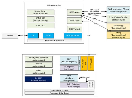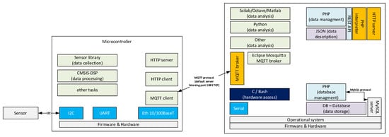 The protocols used in the presentation layer in OSI-ISO model (Figure 3) are generally responsible for ensuring the security of transmission in three main aspects: authentication, confidentiality, and integrity of data. The fault diagnosis server side of the channel is always authenticated, and the client (microcontroller) side is optionally authenticated. Confidentiality means that the data sent over the channel after establishment is only visible to the endpoints. Integrity means that data sent over the channel after establishment cannot be modified by attackers without detection. The latest version of TLS (Transport Layer Security) is 1.3 [] presented in 2018. The layer allows us to use asymmetric cryptography or symmetric cryptography with a pre-shared key. The highest level in the reference model is the application layer, where the HTTP (Hypertext Transfer Protocol) and MQTT (Message Queuing Telemetry Transport) protocols are widely used in IoT applications. The text-based HTTP protocol was widely used in version 1.1 [] developed in 1997 []. HTTP/1.1 can be upgraded to the WebSocket protocol [], which is useful for established connections to exchange data streams in a bidirectional manner. The next version 2.0 of HTTP was shown in 2015 [], where the protocol was changed to binary encoding instead of text. The newest version 3.0 of HTTP was introduced in June 2022 []. HTTP/3 uses a new transport layer protocol QUIC (Quick UDP Internet Connections) [] standardized in 2021 instead of TCP. The QUIC transport protocol uses UDP and TLS to provide a stream of binary frames between client and server. Streams can be intended by the client or server as unidirectional or bidirectional. The HTTP/1.1 protocol can be adopted in the batch processing of faults as the request–response principle (Figure 1). The connection is closed by the fault diagnosis server after the response has been sent to the client request. HTTP/1.1 upgraded to WebSocket, HTTP/2, and HTTP/3 are suitable for the stream processing principle (Figure 1) because the connection is not closed after the server sends the response. The HTTP server can be implemented on the microcontroller (thing) or on the remote computer (cloud), see Figure 4.