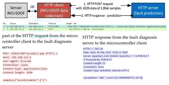 Fault diagnosis as batch processing with HTTP/1.1 request–response header is shown in Figure 5. The microcontroller acts as an HTTP client which sends sensor-collected data in JSON (JavaScript Object Notation) format of 4294 character length by the POST method. The server path is /…/predict.php in the request line. The HTTP server responds 200 OK in the status line, which means that the data were processed correctly and machine state prediction is given in the response message body in JSON format. Presented response contains predicted class “prediction”:“idle” and probability “score” of each class as array in order: normal, idle, and fault.