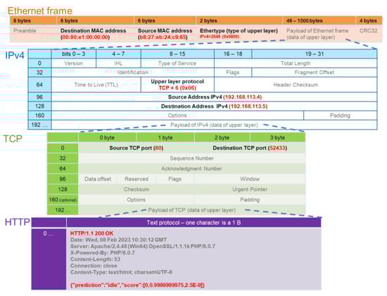 Data from the application layer are encapsulated by lower layer headers. Figure 6 presents the encapsulation of HTTP/1.1 response from server to client. Data from HTTP/1.1 layer are put into the field payload of TCP and the header of TCP needs to be filled. The default TCP port is 80 for the HTTP/1.1 server.