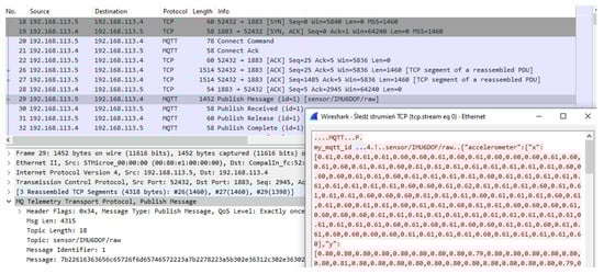 The three step TCP handshake from the 52432 client port to the 1883 server port is presented in Figure 8 to establish the connection. After successful subscription, the MQTT microcontroller client send messages to other clients through the broker. The topic can be treated as a buffer name in the producer–consumer architecture. The designed fault diagnosis system consists of two MQTT clients subscribed to topics: sensor/IMU6DOF/raw and sensor/IMU6DOF/predict. The microcontroller MQTT client writes sensor data to the topic sensor/IMU6DOF/raw, and the MATLAB MQTT client retrieves those samples in JSON format. Received samples are transformed into features by digital signal processing methods, which are then evaluated by the classification algorithm. The prediction of classification algorithm is transformed into JSON (e.g., {“prediction”:“idle”,“score”:[0,0.9999999955,4.5E-9]}) and sent to sensor/IMU6DOF/predict topic.