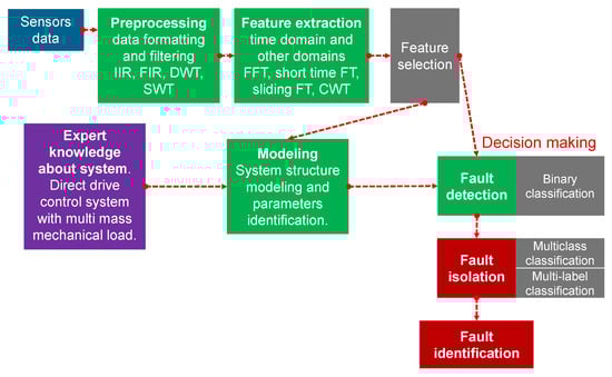The fault diagnosis system (Figure 9) detects faults based on changes in features over time. The fault diagnosis system works with the client–server architecture in the IT network [,,,,,,]. The features are extracted from raw measurements and data or pre-processed data. Fault detection means recognition in the change of machine state caused by one or more faults. It can be treated as anomaly state detection, so any state different from normal behavior can be detected. Fault isolation is the recognition of which parts of the machine have faults. Finally, fault identification answers how wide the damages are. The information about the fault can be used by the maintenance team to repair the system. However, if repair is not possible immediately and the system cannot be stopped safely, then FTC (fault tolerant control) is a key component. The system can have hardware redundancy, which will be used if failure occurs, however, it is expensive to duplicate parts and not always technically possible to apply. FTC allows to continue the system usage of the system with performance constrains [,,,,,].