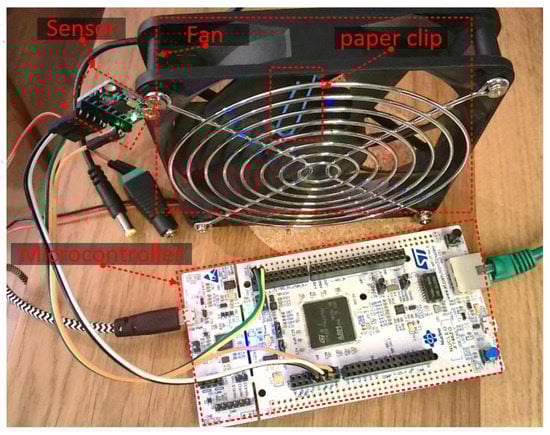 The demonstration shows classification of computer fan work into classes: idle, normal, or fault. The failure is caused by a paper clip added to the fan blade. The prepared demonstration setup (shown in Figure 10) consists of a NUCLEO board with STM32F746ZG microcontroller that handles the IMU-6 DOF (inertial measurement unit with 6 degrees of freedom) MPU6050 sensor. Data are collected synchronously with constant sampling time equal to 5 ms (sampling frequency 200 Hz). The vector of 128 samples from the 3-axis accelerometer and 3-axis gyroscope is then transformed into JSON (JavaScript Object Notation) as the object {“accelerometer”:{“x”:[],“y”:[],“z”:[]},”gyroscope”:{“x”:[],“y”:[],“z”:[]}}, where the array “[]” contain samples. Data are sent on the topic “sensor/IMU6DOF/raw” by the MQTT client implemented in the microcontroller to the MQTT broker hosted on a personal computer. Eclipse Mosquitto™ was used as an MQTT broker []. The data stream was processed in real time by MATLAB R2022b with the MQTT client [].