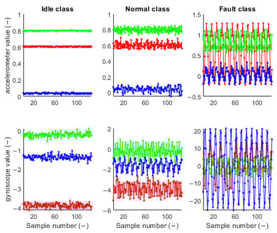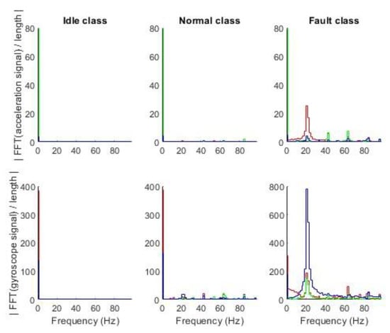 The first stage is data collection at predefined class states for several seconds. Data collected in one micro batch in time domain are shown in Figure 11. Data were collected for three states of the fan: (1) idle class—fan power is switched off, (2) normal class—fan power without paper clip is switched on, and (3) fault class—fan power with paper clip is switched on. The time domain signal for the idle class has a constant signal with noise, the signal in the normal class has small oscillations, and the signal in the fault class has significant oscillations compared to previous classes. Data were transformed to the frequency domain by the FFT function in MATLAB, resulting in a complex number vector. The absolute value of the complex numbers is shown in Figure 12. Each class has different frequency features in the range of 0 Hz to 100 Hz. The most significant change in frequency occurs on the Z axis of the gyroscope.