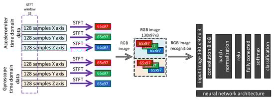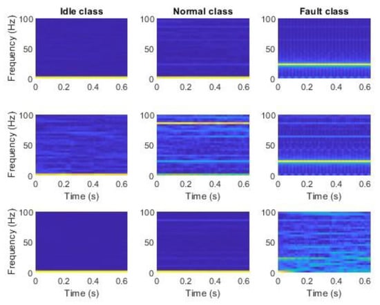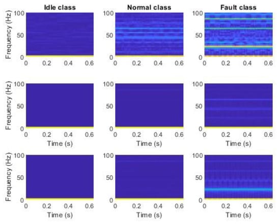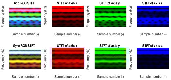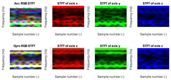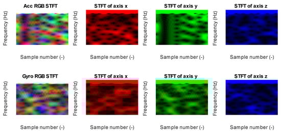 Data from each axis of IMU 6-DOF were transformed into the time–frequency domain by applying STFT (short-time Fourier transform) with 32 samples of window length and 31 samples of overlap (see Figure 16, Figure 17, Figure 18, Figure 19 and Figure 20). As a result of STFT at 128 time domain samples of single axis, there was a two-dimensional signal of 65 frequencies at 97 time moments. The process was repeated for each axis of accelerometer and gyroscope. Finally, six images for 128 × 6 samples of IMU 6-DOF were obtained in the time–frequency domain for each class: idle in Figure 17, normal in Figure 18, and fault in Figure 19. These six images are combined into one RGB (red, green, and blue) image of size 130 × 97 × 3 in Figure 16; representative RGB images for each class are shown in Figure 20.