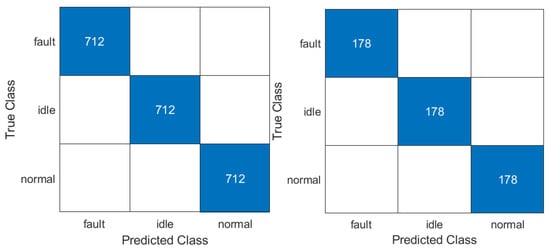 Data collected in the time domain for each class were converted into time–frequency RGB images. Together, the dataset has 2670 RGB images divided into classes: fault with 890 RGB images, idle with 890 RGB images, and normal with 890 RGB images. All images, which were divided into training and validation datasets. From the dataset, 80% is the training set (2136 RGB images) and 20% is the testing set (534 RGB images) which were randomly selected. CNN (convolutional neural network) training was performed in MATLAB Deep Learning Toolbox [] with the support of NVIDIA GPU (graphics processing unit) with CUDA® (Compute Unified Device Architecture). Validation of the trained convolution neural network confirms good classification, shown as a confusion matrix in Figure 21.