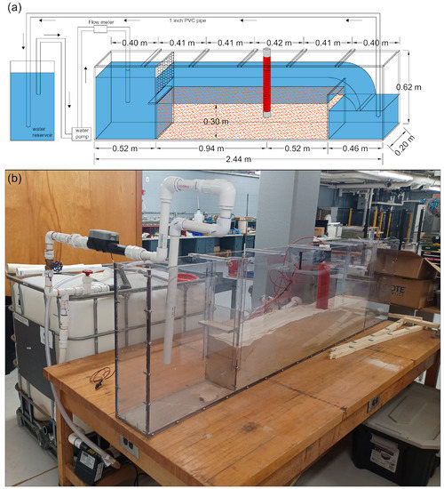 The used flume setup: (a) a schematic diagram of the flume setup showing its dimensions in meters and (b) the actual setup used to test the performance of the FO-DTS scour-monitoring device.