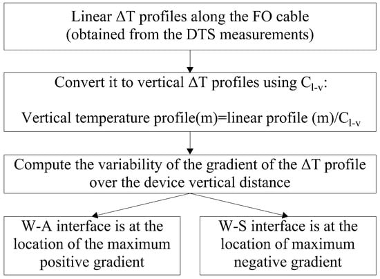 An algorithm was created to automatically identify the location of the W-A and S-W interfaces. A flow chart of the scour detection algorithm is shown in Figure 3. The input to the algorithm was the vertical profile of the average obtained over the heat pulse duration of 600 s. The vertical profile was obtained from the linear profile observed along the FO cable by dividing its distance by a conversion coefficient , which was estimated from the geometric relationship between the outer diameter of the PVC pipe () and the diameter of the FO cable (= 1.88 cm), according to Equation (1).